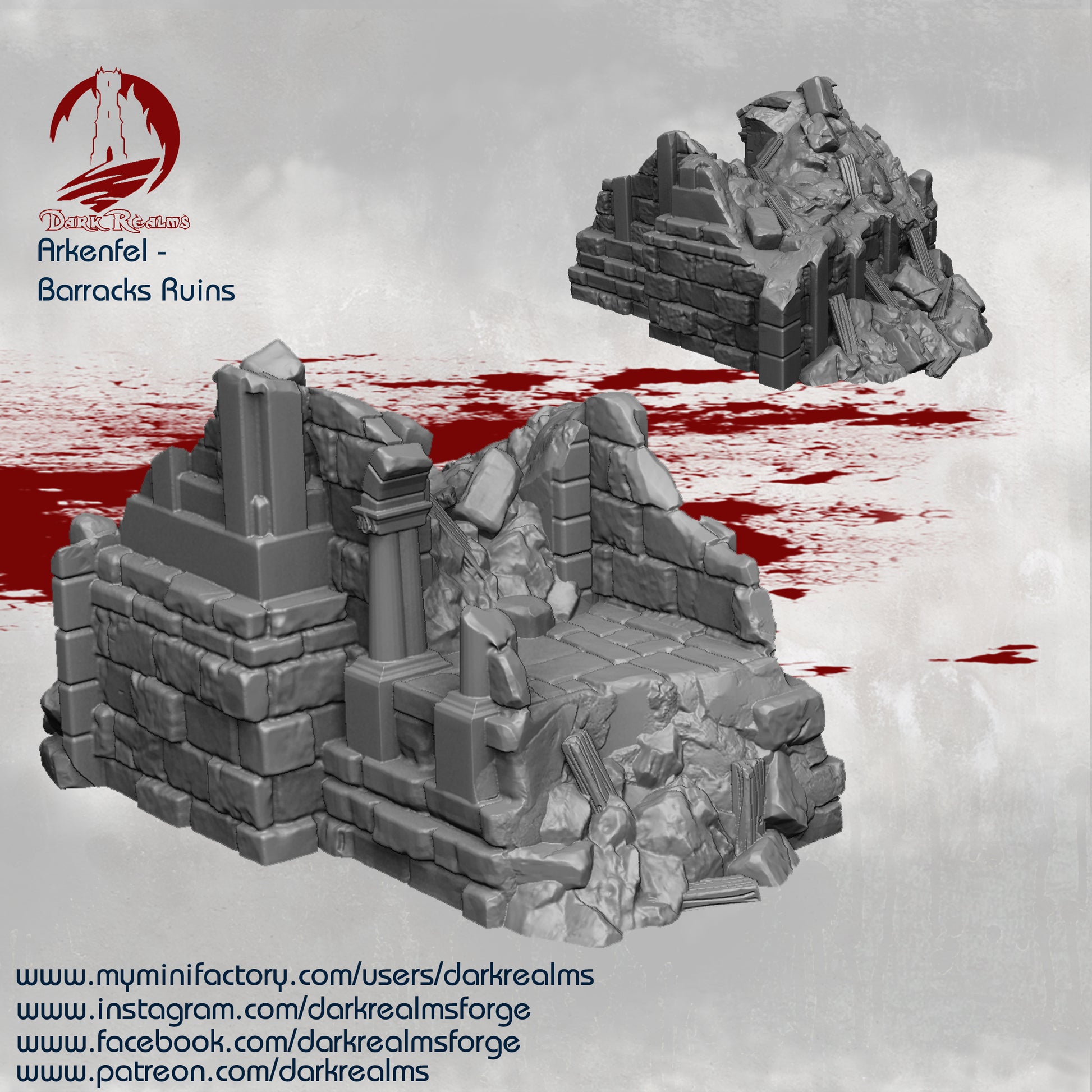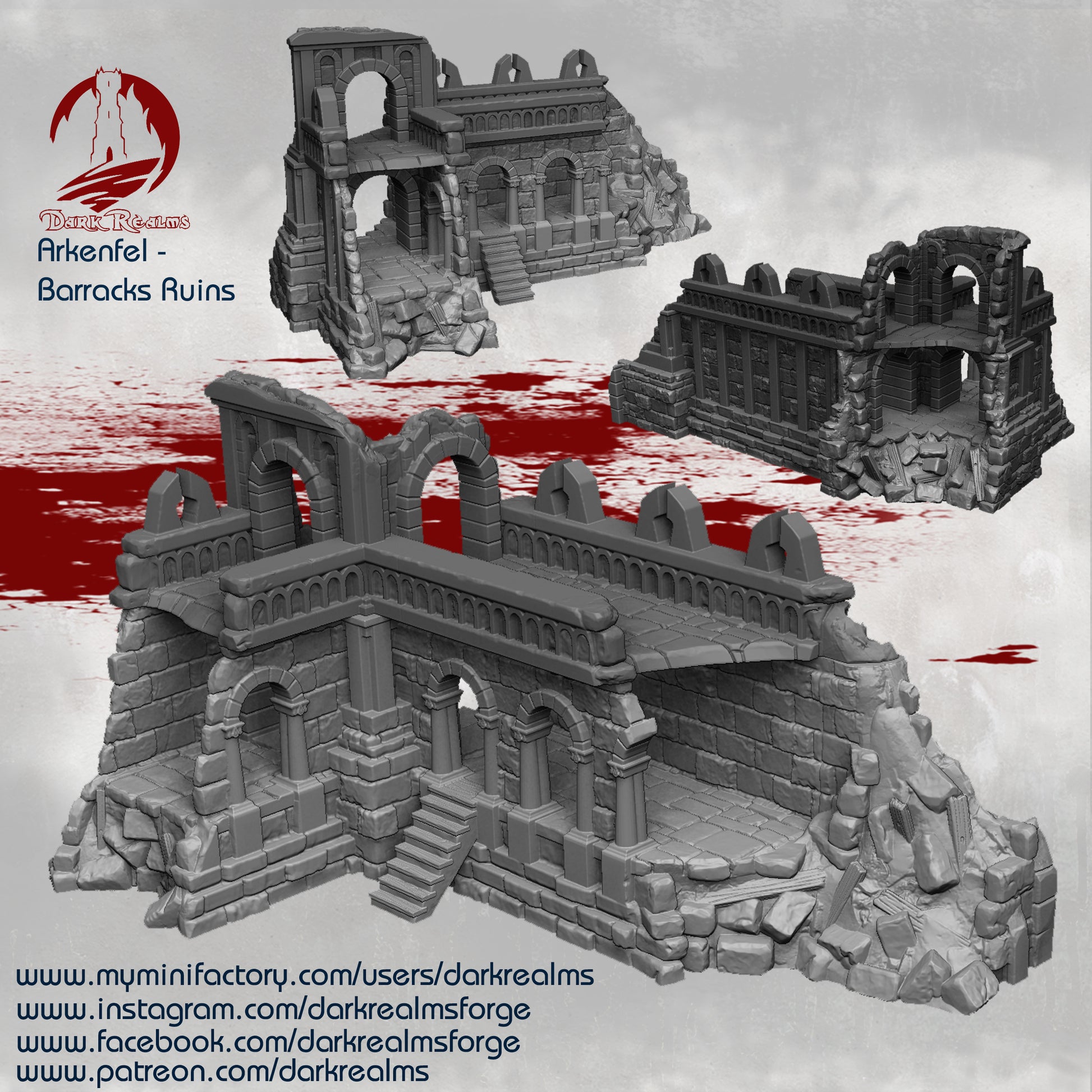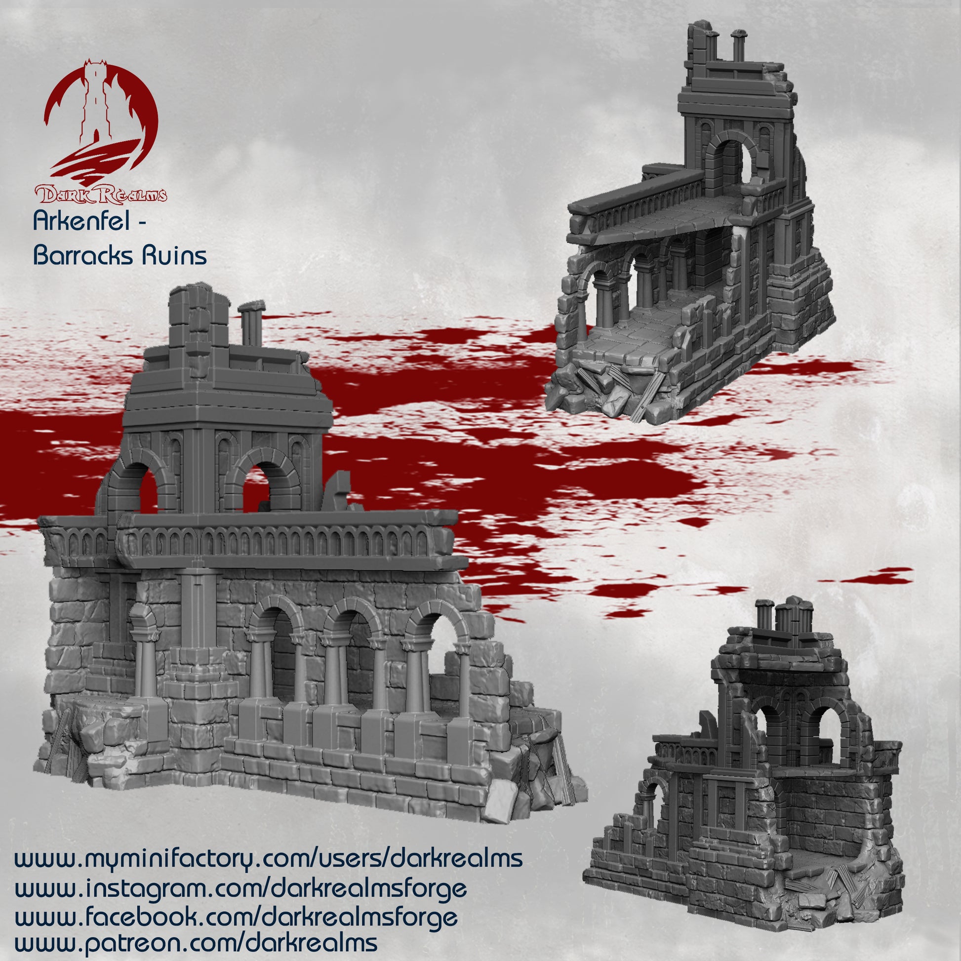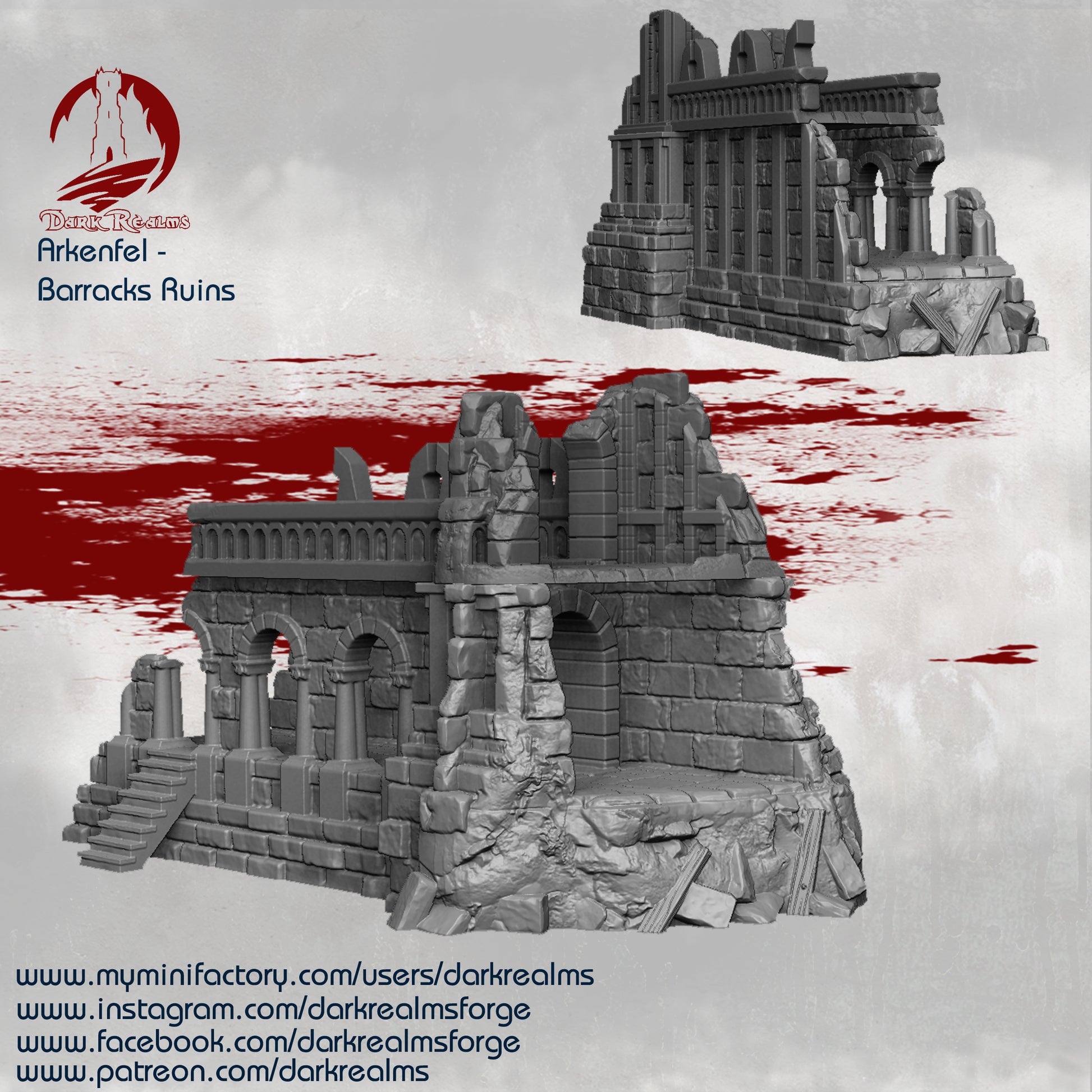 Explore the fallen Arkenfel city with this amazing Ivory Citadel Barracks Ruins by Dark Realms. This is a huge set for your table!