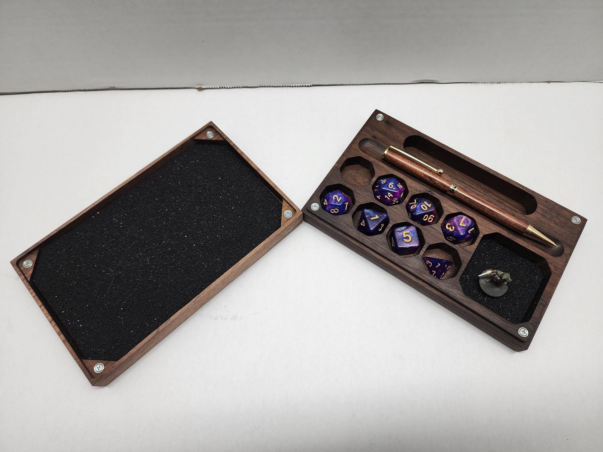 Level up your tabletop gaming with this handcrafted Hardwood Dice Box, designed to hold everything you need for your next adventure. With dedicated compartments for a set of 7 polyhedral dice, a pen, and a cell phone, this sleek and functional box keeps your essentials organized and within reach.
